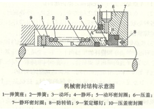 2、B點(diǎn)是靜環(huán)與壓蓋之間的密封。這是一種靜密封,各種臥式管道離心泵的機(jī)械密封通常采用各種形狀的有彈性的輔助密封圈來(lái)防止液體從靜環(huán)和壓蓋之間的縫隙泄漏。
